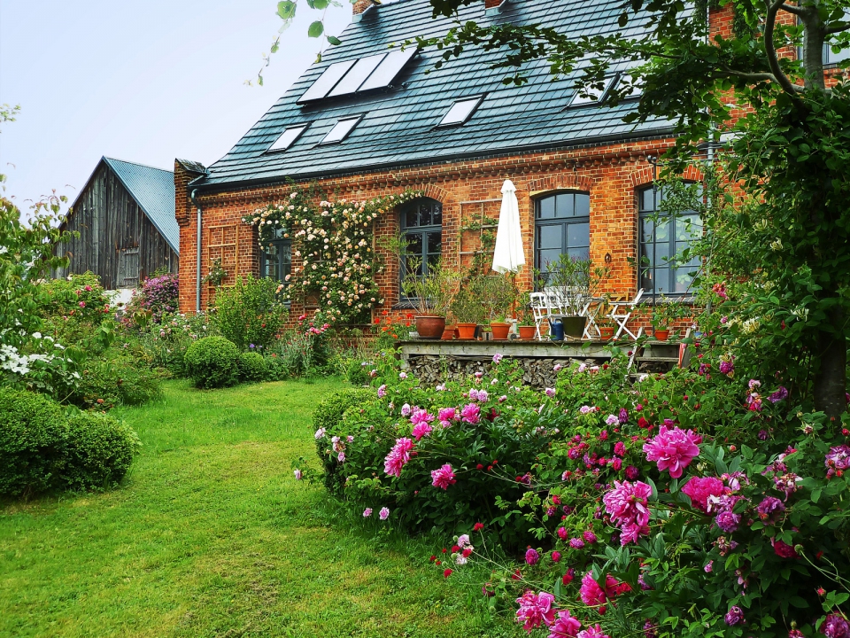 Im weitläufigen Naturgarten mit über 400 alten Rosensorten steht ein Saunahaus mit Ruheraum, das für gemütliche Entspannung sorgt.