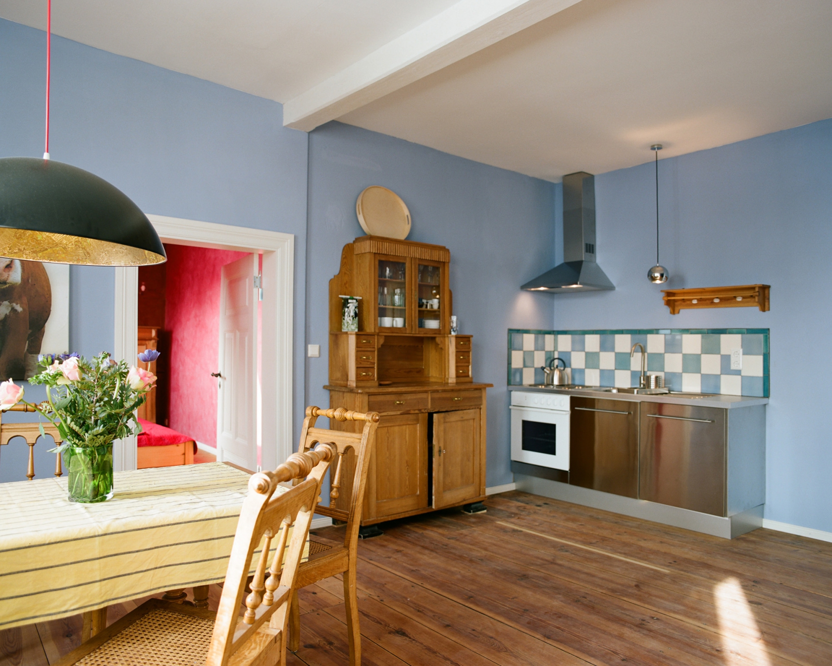 Der kornblumenblau gefasste Wohnraum mit 6 Essplätzen, einem gemütlichen Sofa rund um den Kaminofen bietet viel Raum und ist mit einer funktionalen Küchenzeile ausgestattet.